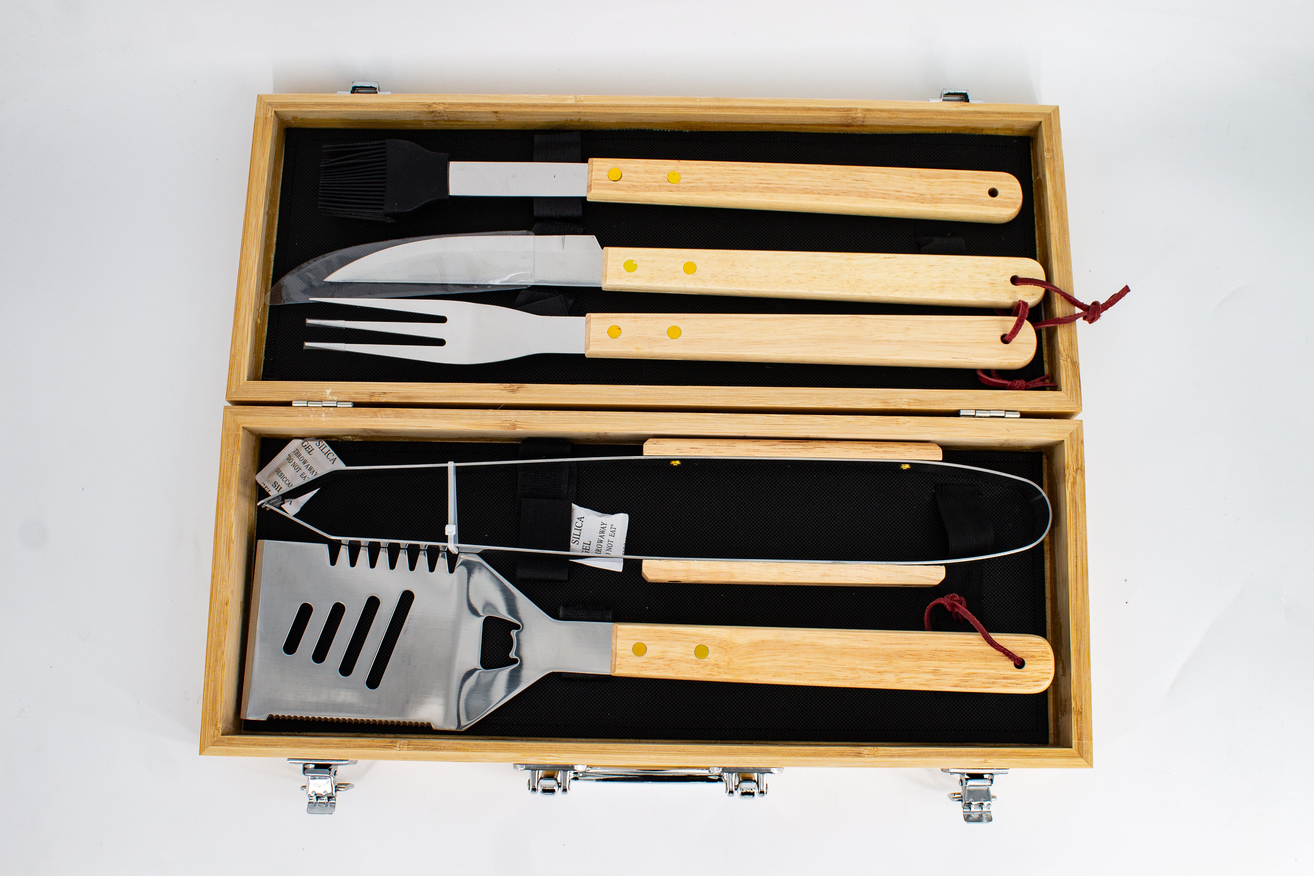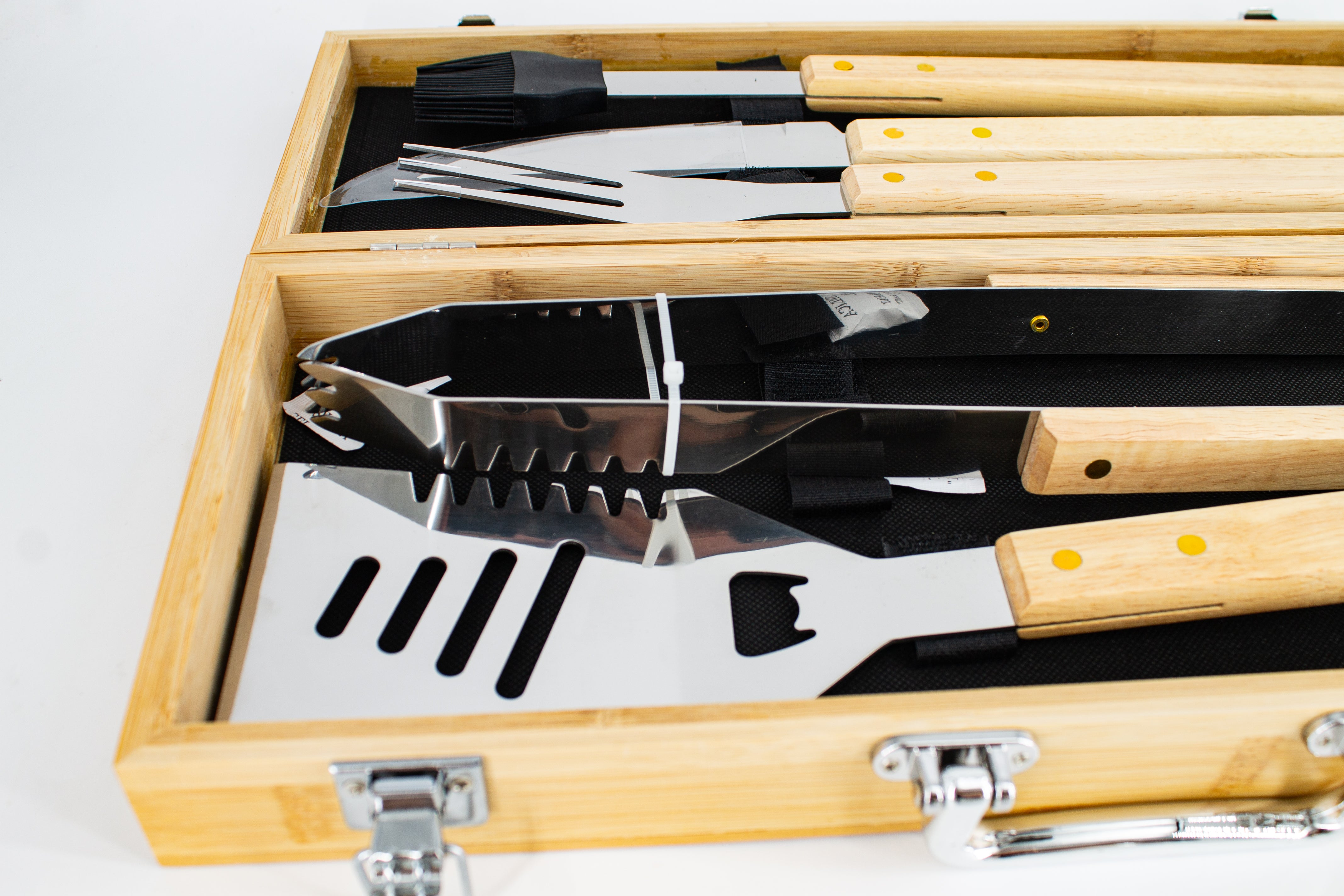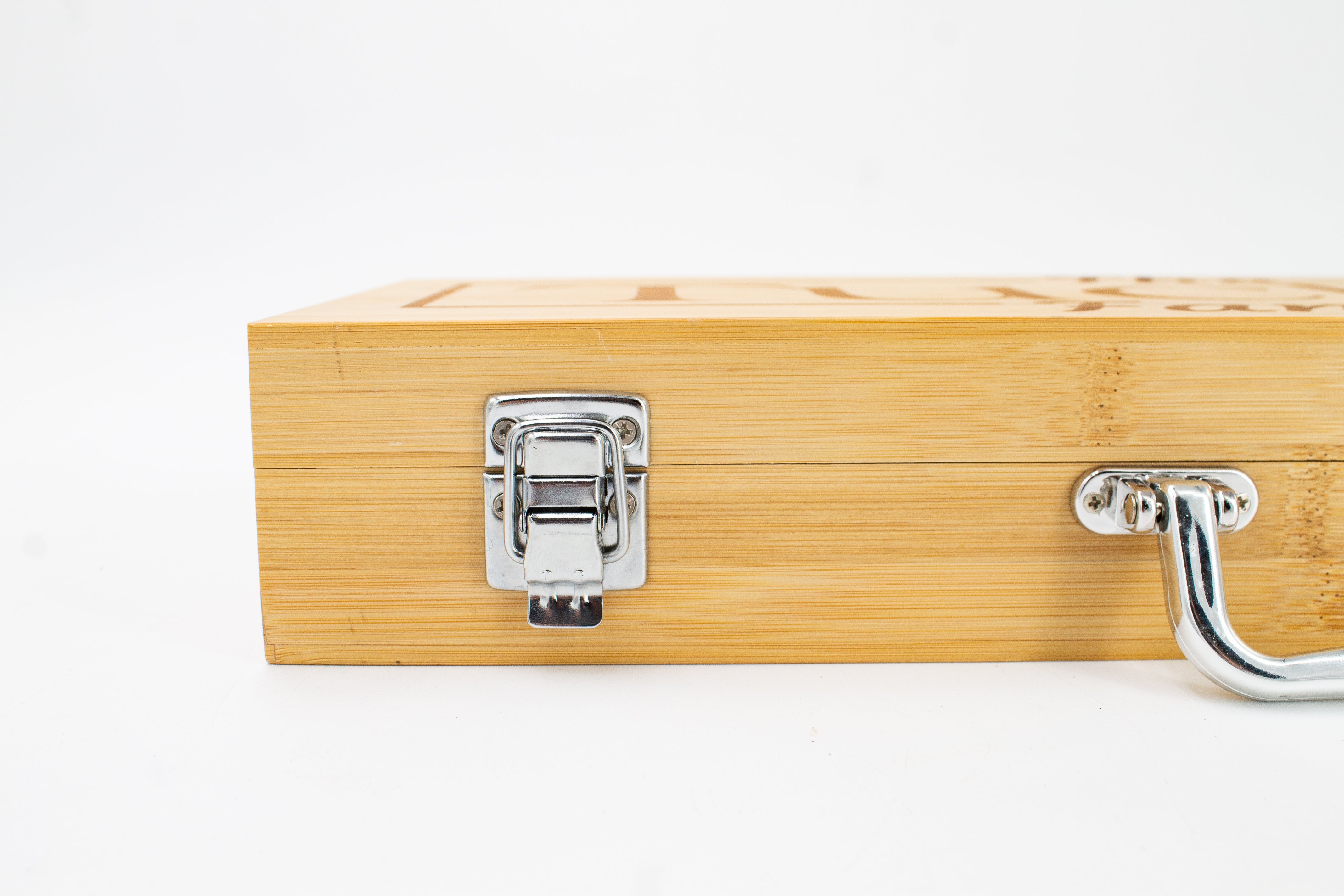 This fully customizable grill set comes in a sleek bamboo case, making it an ideal gift for Father's Day. Designed for sports enthusiasts who enjoy outdoor cooking, it includes essential tools crafted for durability and ease of use. The bamboo case ensures organized storage and portability, perfect for tailgates, barbecues, or backyard grilling sessions. Elevate your grilling experience with this expert-quality set tailored to your preferences.