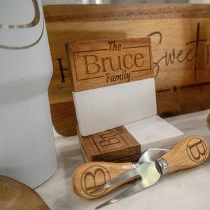 - 1 × engraved 4-piece marble/wood coaster set